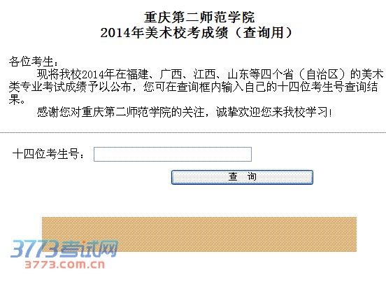 重庆第二师范学院2014年美术类校考专业成绩查询开通,考生可登陆成绩查询系统,输入十四位考生号进行查询;成绩查询网址:http://dep.cque.edu.cn/chaxun/