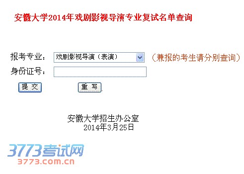 安徽大学2014年戏剧影视导演(表演)、戏剧影视导演(表演主持)专业复试名单查询http://zsb.ahu.edu.cn/2014dyfsmd/