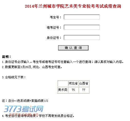 兰州城市学院2014年美术类专业校考考试成绩查询开通,身份证号必须输入,考生号或准考证号可任意输入一个进行查询;请认真核对输入内容。数据更新至3月26日,河北、山西考生可查。