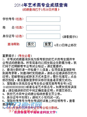 中南林业科技大学2014年艺术类校考成绩查询入口