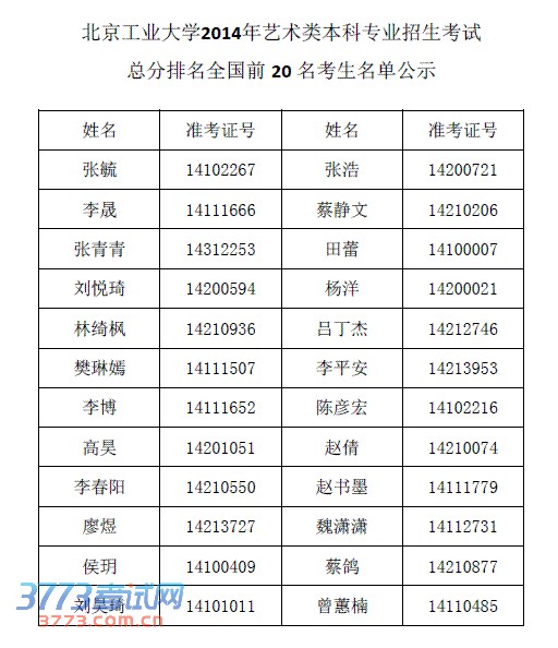 北京工业大学2014年艺术类本科专业招生考试总分排名全国前20名考生名单公示