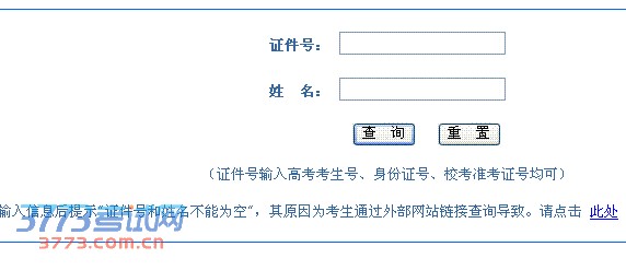 输入信息后提示"证件号和姓名不能为空",其原因为考生通过外部网站链接查询导致。请点击 此处 通过学校网站进入查询.