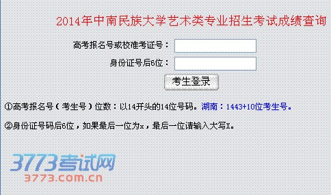2014年中南民族大学艺术类专业招生考试成绩查询 高考报名号或校准考证号: 身份证号后6位: ①高考报名号(考生号)位数:以14开头的14位号码。湖南:1443+10位考生号。