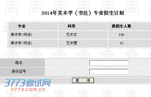 曲阜师范大学杏坛学院2014年美术类(书法)专业成绩查询开通:查询网址http://zjc.xtxy.cn/lqcx/yscjcx.php2014年美术学(书法)专业招生计划 专业 科类 拟招生人数 美术学(书法) 艺术文 140 美术学(书法) 艺术理 10