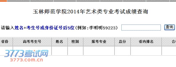 玉林师范学院2014年美术类、音乐舞蹈类专业成绩查询开通了,合格数据正在上报审核中,合格证情况预计4月中旬开始提供查询。成绩查询网址:http://www.ylnu.net/zsw/yscjcx/indexcx.asp玉林师范学院2014年艺术类专业考试成绩查询