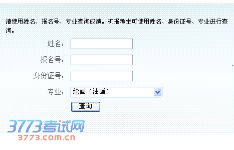 姓名: 报名号: 身份证号: 请使用姓名、报名号、专业查询成绩。机报考生可使用姓名、身份证号、专业进行查询。 专业: 绘画(油画) 中国画 视觉传达设计 美术学(美术教育) 服装与服饰设计 环境设计 视觉传达设计(影像设计)