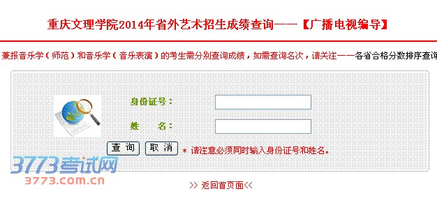 重庆文理学院2014年省外艺术招生成绩查询——【广播电视编导】 * 兼报音乐学(师范)和音乐学(音乐表演)的考生需分别查询成绩,如需查询名次,请关注——各省合格分数排序查询。