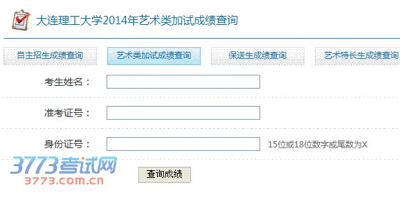 大连理工大学2014年艺术类加试成绩现已发布,请考生登录大连理工大学招生网http://recruit.dlut.edu.cn/jsp/DG1400E_Enq.jsp成绩查询”中点击“艺术类加试成绩查询”版块查询测试结果。考生须同时输入姓名、加试准考证号、身份证号查询成绩。