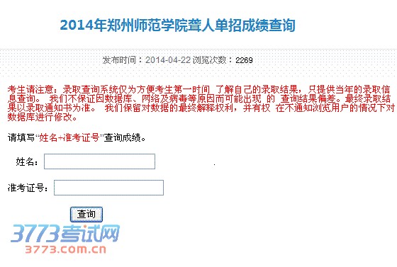 2014年郑州师范学院聋人艺术类单招成绩查询 http://zsb.zznu.edu.cn/s/97/t/1236/6d/31/info27953.htm考生请注意:录取查询系统仅为方便考生第一时间了解自己的录取结果,只提供当年的录取信息查询。我们不保证因数据库、网络及病毒等原因而可能出现的 查询结果偏差。最终录取结果以录取通知书为准。我们保留对数据的最终解释权利,并有权在不通知浏览用户的情况下对数据库进行修改。