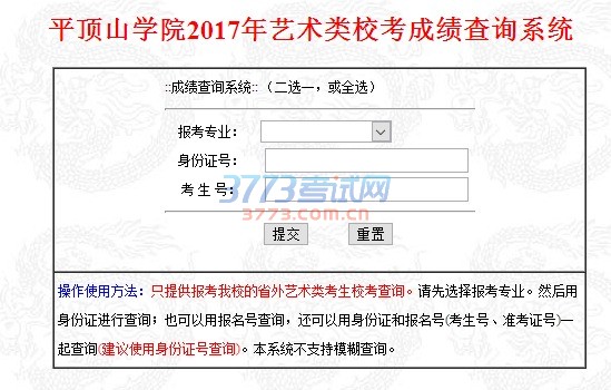 操作使用方法:只提供报考我校的省外艺术类考生校考查询。请先选择报考专业。然后用身份证进行查询;也可以用报名号查询,还可以用身份证和报名号(考生号、准考证号)一起查询(建议使用身份证号查询)。本系统不支持模糊查询。