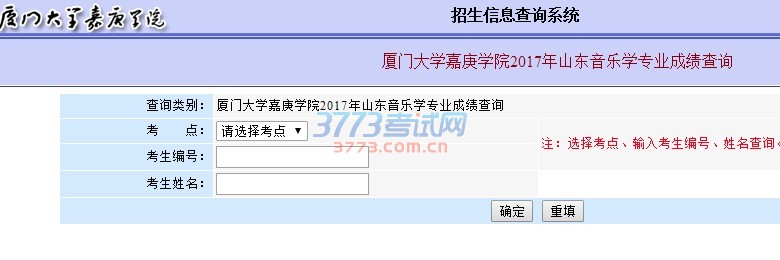 厦门大学嘉庚学院2017年山东音乐表演专业成绩查询 查询类别: 厦门大学嘉庚学院2017年山东音乐表演专业成绩查询考 点: 注:选择考点、输入考生编号、姓名查询。考生编号: 考生姓名: 确定 重填