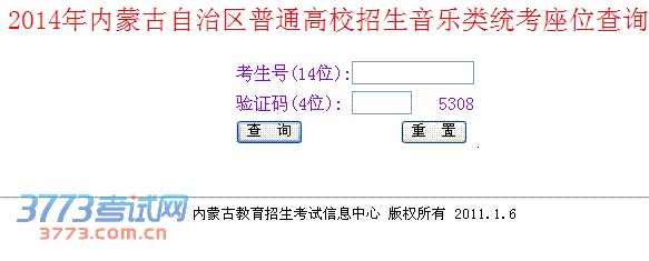 2014年内蒙古自治区普通高校招生音乐类统考座位查询系统 考生号(14位): 验证码(4位): 5308
