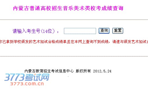 请输入考生号(14位): 提醒各位考生注意: 如果你已拿到学校颁发的艺术加试合格成绩单且在本网上查询不到成绩,请速与颁发艺术加试合格成绩单的院校联系。