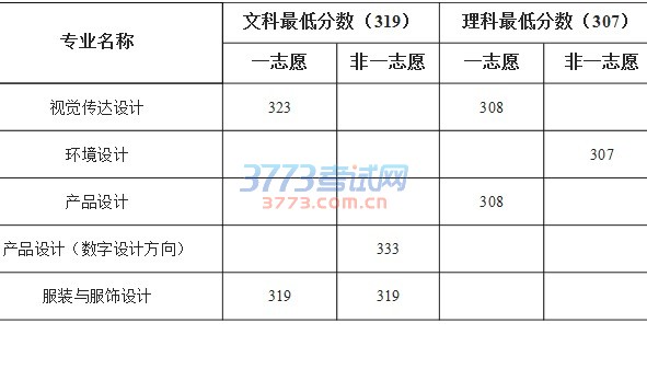 2016年杉达山东艺术类录取分数线 专业名称 文科最低分数(319) 理科最低分数(307) 一志愿 非一志愿 一志愿 非一志愿 视觉传达设计 323 308 环境设计 307 产品设计 308 产品设计(数字设计方向) 333 服装与服饰设计 319 319