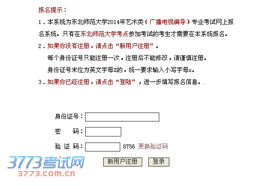 报名提示:1.本系统为东北师范大学2014年艺术类(广播电视编导)专业考试网上报名系统。只有在东北师范大学考点参加考试的考生才需要在本系统报名。2.如果你没有注册,请点击“新用户注册”。 每个身份证号只能注册一次,注册后不能修改,请谨慎注册。 身份证号末位为英文字母X的,统一要求输入小写字母x。3.如果你已经注册,请点击“登陆”,进一步填写报名信息。 身份证号: 密 码: 验 证 码: 8756 更换验证码