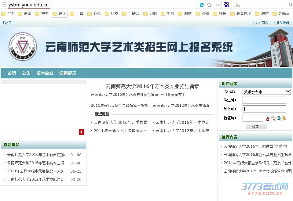 打开浏览器,在浏览器地址栏输入:ysbm.ynnu.edu.cn,按enter键进入系统。建议使用IE9及以上版本浏览器或360极速浏览器,有兼容和极速模式的浏览器,使用兼容模式打印准考证。
