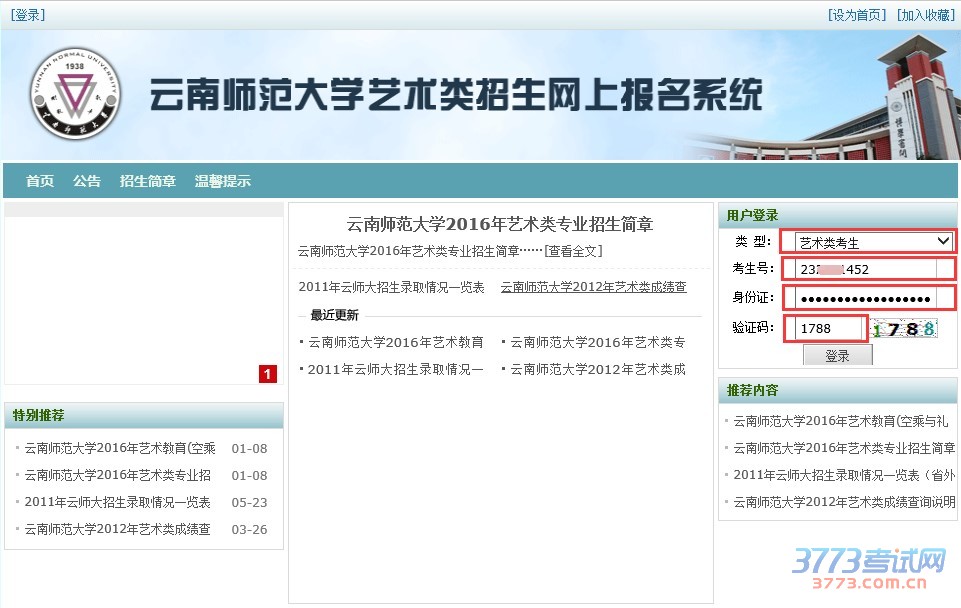 类型选择“艺术类考生”,依次输入由县(市、区)招办签发的艺术类专业《报考证》考生号(9位数)、身份证号和验证码,点击“登录”按钮即可登录系统。