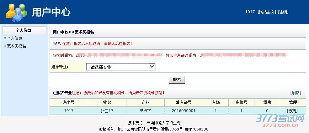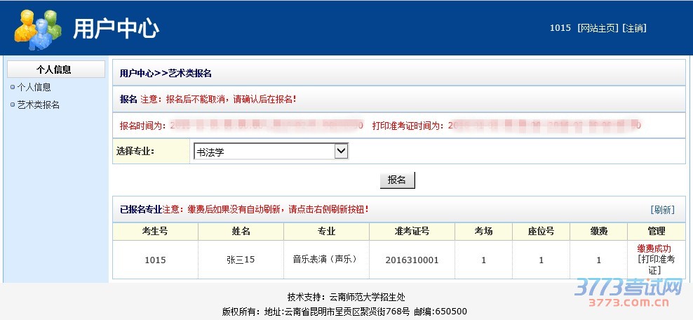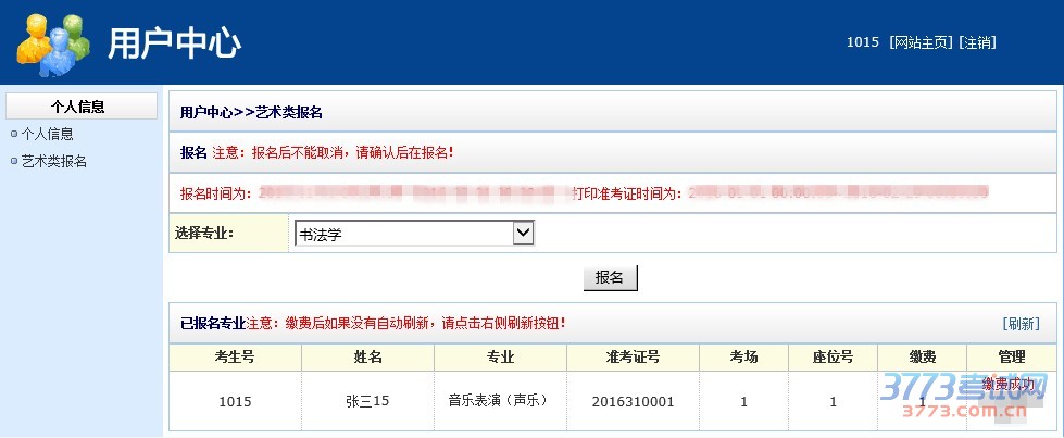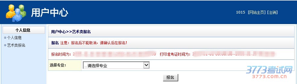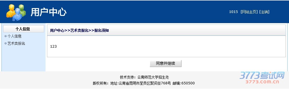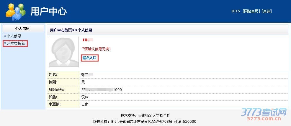系统登录后,会跳转到后台页面,如图3。仔细核对自己的个人信息,确认无误后,点击“报名入口”或者“艺术类报名”进入报名界面。