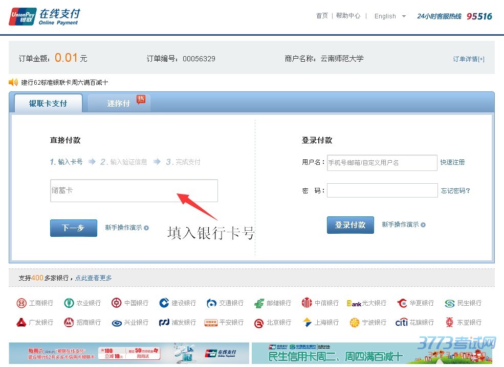 4.跳转到“银联在线支付”页面,输入银行卡号后点击“下一步”。
