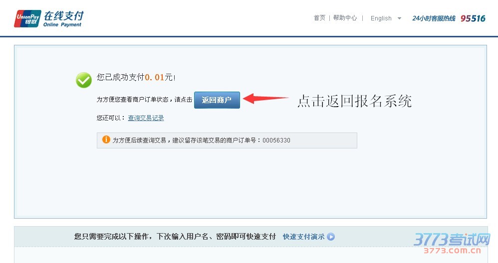 6.支付成功后,点击“返回商户”,返回报名系统继续考试报名的其他操作。