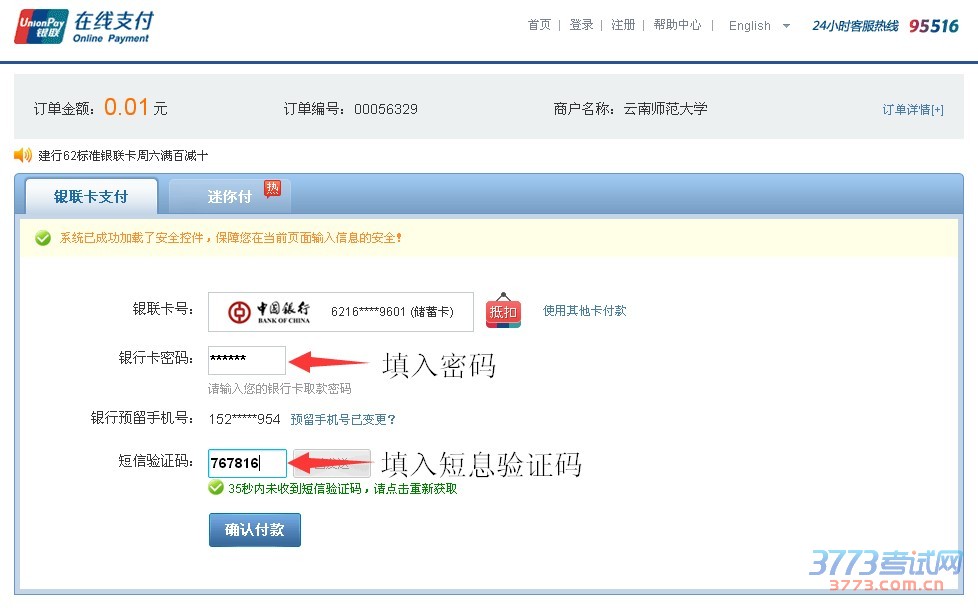 5.根据提示分别在对应的框内输入“银行卡密码”和手机短信接收到的“验证码”,确认无误后点击“确认付款”