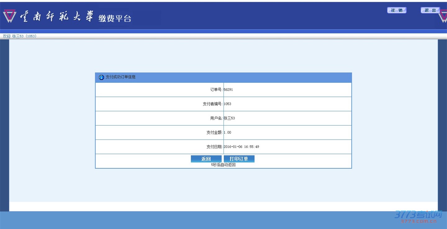 点击“点击此处返回”,会出现如图16页面。缴费栏会出现相应的缴费数目,管理栏会显示缴费成功。