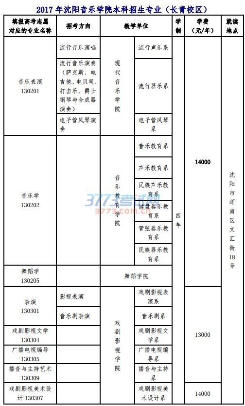 2017 年沈阳音乐学院本科招生专业(长青校区)