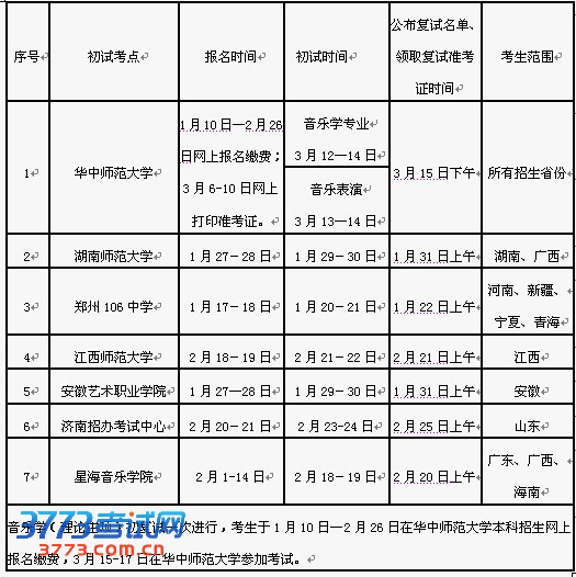 在湖北考点参加初试的考生须在规定时间登录我校招生网http://zs.ccnu.edu.cn进行网上报名缴费,考生须上传个人电子照片,考生于3月6-10日登录我校招生网打印准考证,凡未进行网上缴费的,视报考信息无效。在广东考点参加初试的考生须在规定时间登录星海音乐学院招生网http://www.xhzsb.com/进行网上报名。
