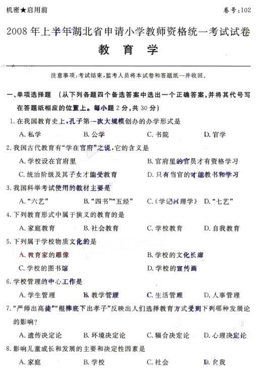 2008上半年湖北省教师资格考试教育学试卷(小学)