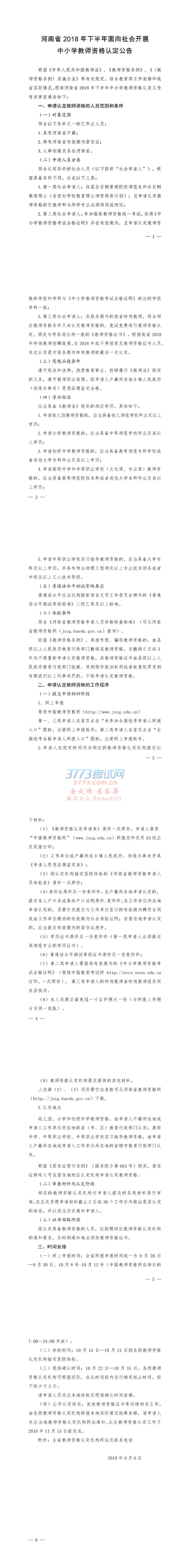 2018下半年河南面向社会开展中小学教师资格认定公告