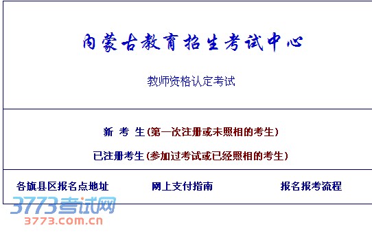 教师资格认定考试 新 考 生(第一次注册或未照相的考生) 已注册考生(参加过考试或已经照相的考生) 各旗县区报名点地址 网上支付指南 报名报考流程