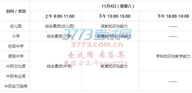 11月4日(星期六)。贵州省2017年下半年中小学教师资格考试笔试所有类别、科目均采用纸笔考试方式进行,每场考试时间为120分钟。
