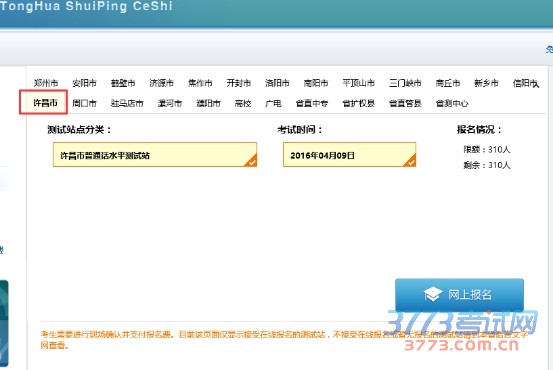 点击页面中间的“我要报名”按钮,进入城市选择页面,点击“许昌市”,出现测试站点、考试计划,如图: