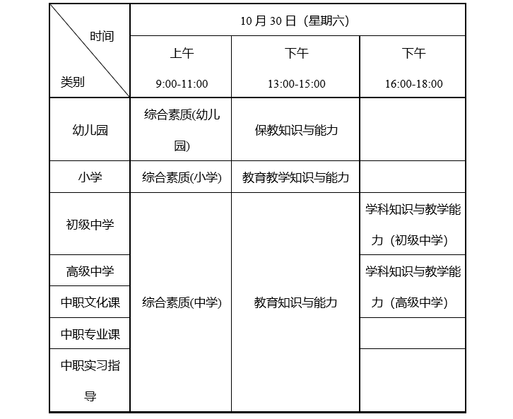 (四)全国统一考试时间为10月30日,各类别考试科目与时间安排如下: