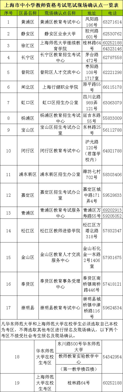 2、请考生按照规定时间到网上报名所选考区相对应的现场确认点进行现场确认各项事宜,包括完成报名信息表上的报名信息确认(含身份与户籍信息、报考科目信息等)、签字提交和缴费等事宜。不得跨区确认,不得代确认,逾期不予受理。未经现场确认或现场确认结束后未按规定提交报名信息表的人员,本次报名无效,若已缴费的,所缴费用不予退回。(重要提示:凡华东师范大学和上海师范大学在校学生必须选取自己本校为考区,不得选取其他考区进行报名及现场确认,这两个考区不接受社会考生报名及现场确认。)