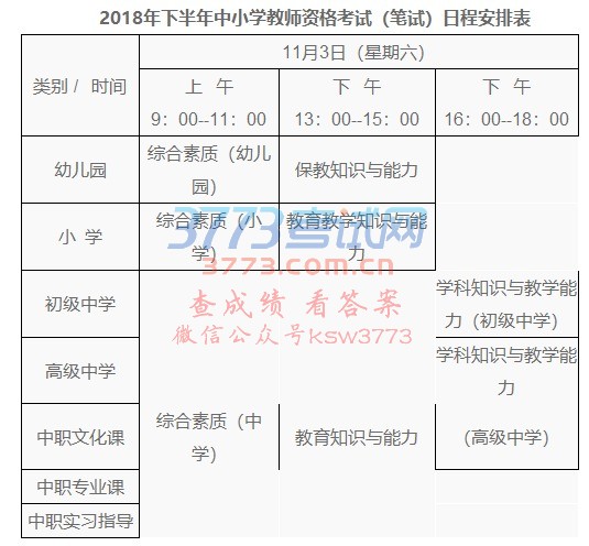 2018年下半年中小学教师资格考试(笔试)日程安排表