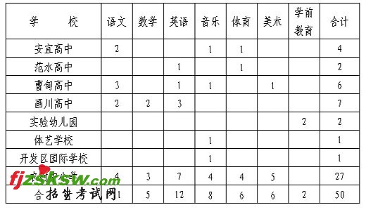 面试成绩分值:语文、数学、英语等学科为50分,音乐、体育、美术、学前教育等学科为20分。
