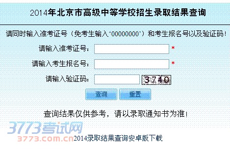 2014年北京市高级中等学校招生录取结果查询 请同时输入准考证号(免考生输入‘00000000’)和考生报名号以及验证码! 请输入准考证号: * 请输入考生报名号: * 请输入验证码: 查询结果仅供参考,请以录取通知书为准! 2014录取结果查询安卓版下载 2014年北京市高级中等学校名额分配招生录取结果查询