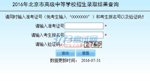 2016年北京市高级中等学校招生录取结果查询 请同时输入准考证号(免考生输入‘00000000’)和考生报名号以及验证码! 请输入准考证号 * 请输入考生报名号 * 请输入验证码: 数据更新时间: 2016-07-31