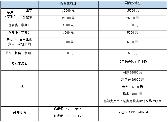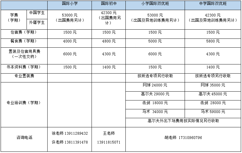 中、小学国际班、国际双优班收费标准