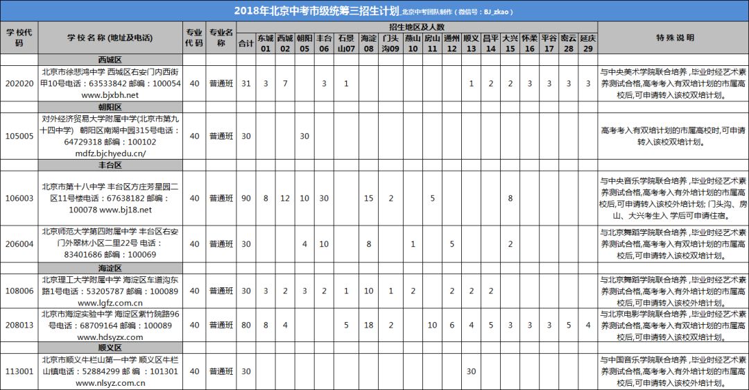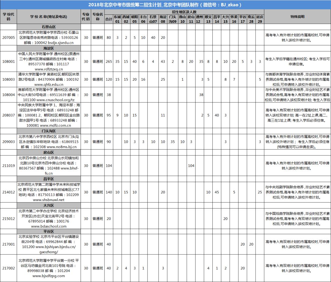 2018年中考,上述这15所学校共拿出了398个名额,分配给除东城、西城、海淀外的北京市其他各区。如下表: