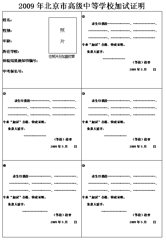 2、学生加试时,应持本人户口薄(身份证)、2009年体检结果通知书、加盖校章的《2009年北京市高级中等学校加试证明》(见附件1,简称加试证明)和《2009年北京市高级中等学校招生考生卡》(见附件2,简称考生卡);进行资格认定的考生应出具家庭经济状况证明(享受低保待遇或特困经济状况证明)和相关获奖证明材料。