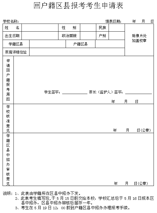 回户籍区县报考考生须在5月15日前向本校提出申请并填写《回户籍区县报考考生申请表》(见附件,以下简称“申请表”),过期不予办理。