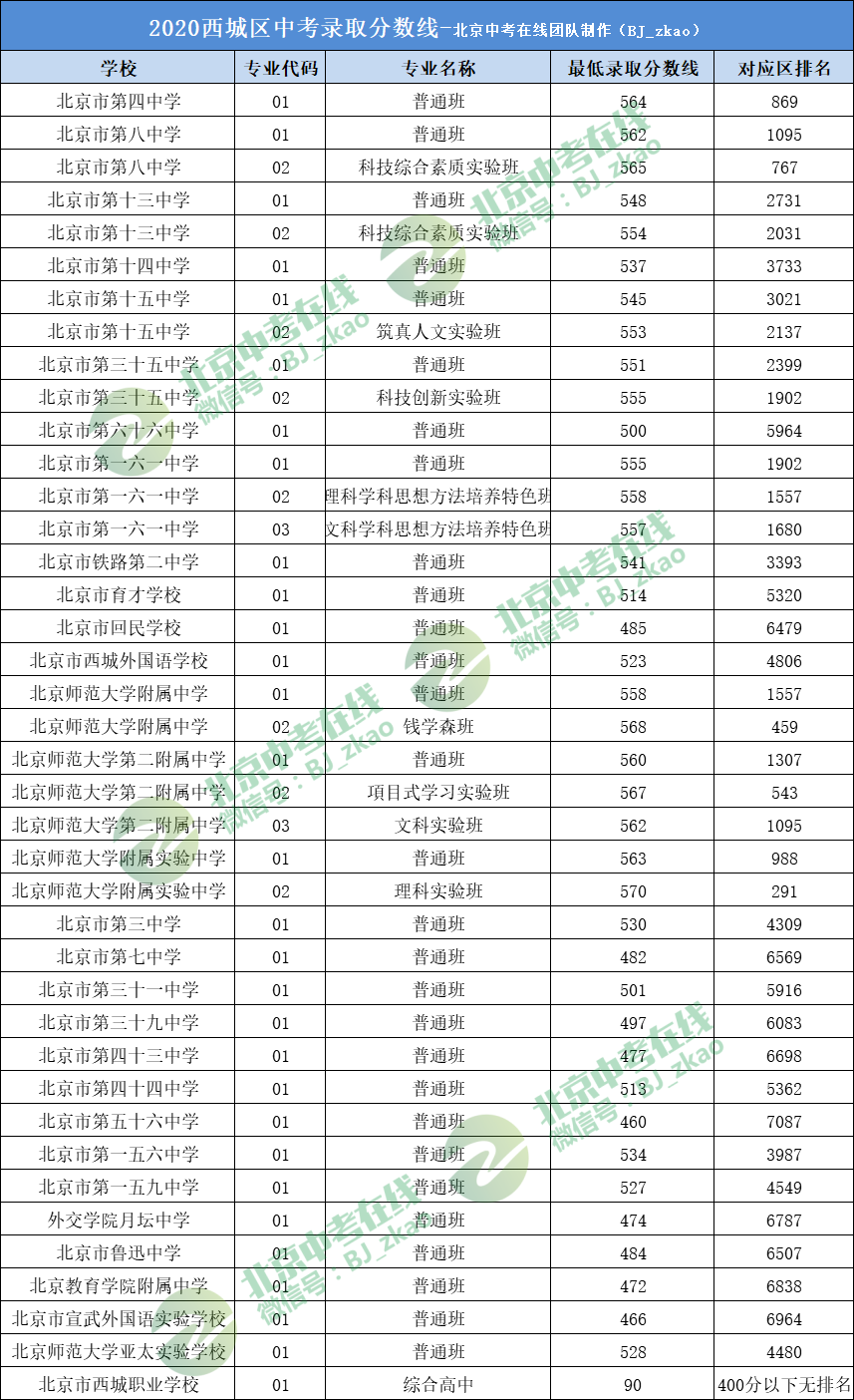 2020北京西城区中考高中录取分数线