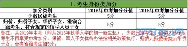 在明年的中考加分新政中,少数民族、留学人员子女的加分政策不变。但从2016年秋季起读初一的少数民族、留学人员子女,在2019年中考的时候,则不享受加分政策了(当然,如果国家有新的规定,成都就按照国家新规执行)。