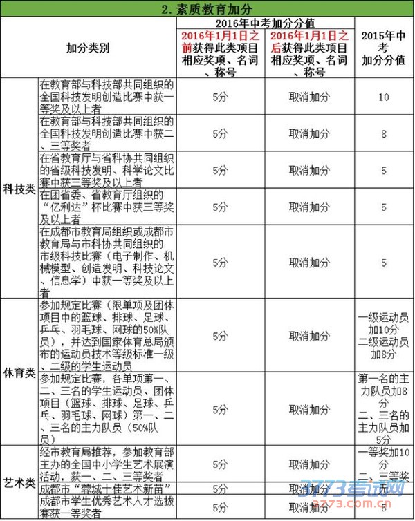 2016年中考的学生要注意,为了配合教育部关于素质教育和中高考加分政策规定,成都市明年将对中考加分政策进行比较大的调整。最受学生关注的三大类加分项目,极有可能取消。这三大类项目是:科技类、体育类、艺术类。每年参加这三大类项目获得证书,并在中考中得到加分的初中生学生是非常多的,很多学校也鼓励学生通过科技比赛、艺术人才大赛、体育项目比赛,一方面培养学生的综合素质,一方面在中考中得到加分,增加录取率。