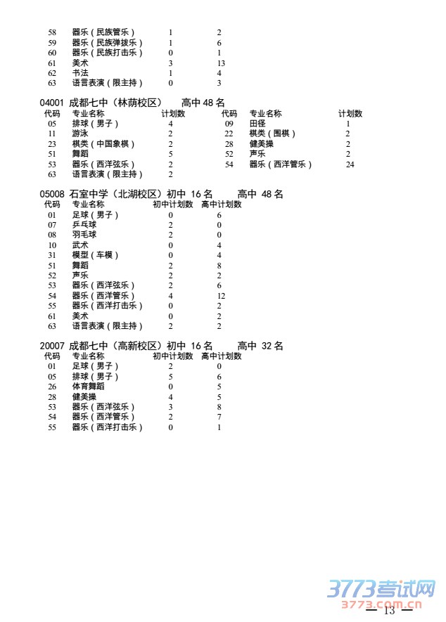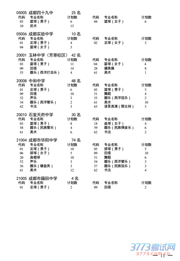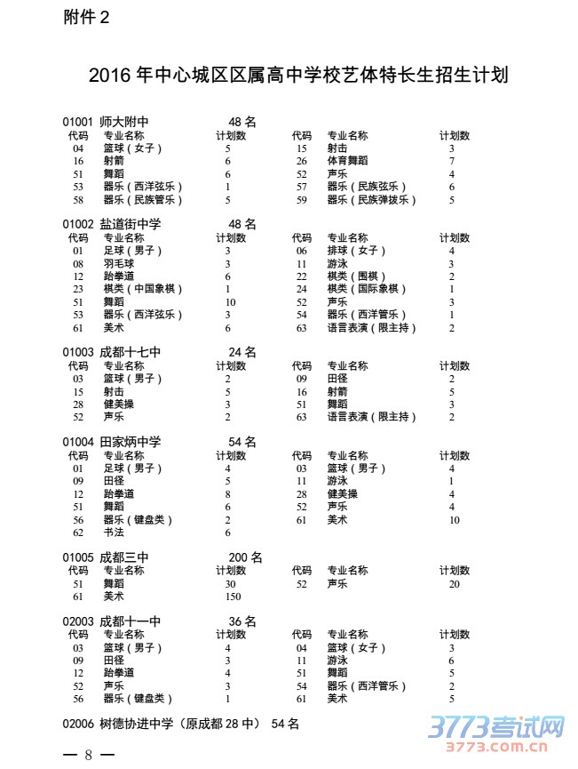 2016年中心城区初中艺体特长生招生学校(校区)