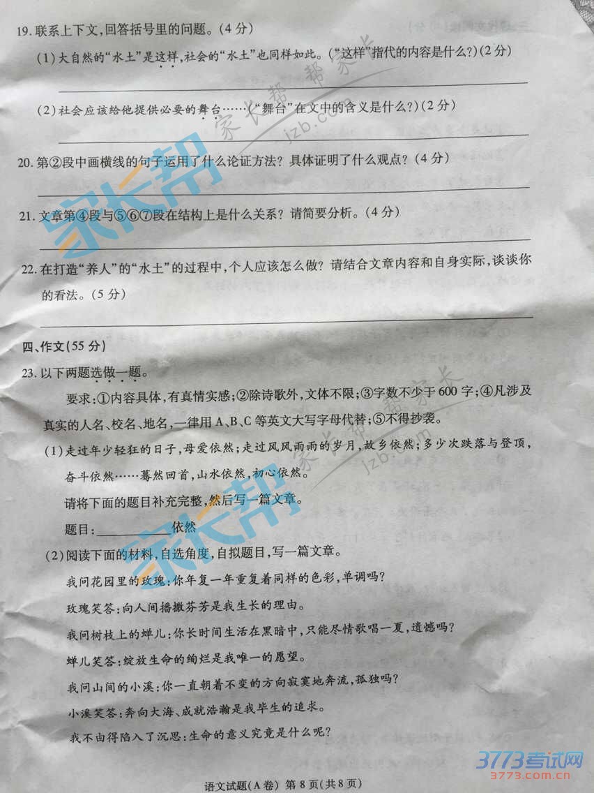 2015重庆中考语文试题B卷发布