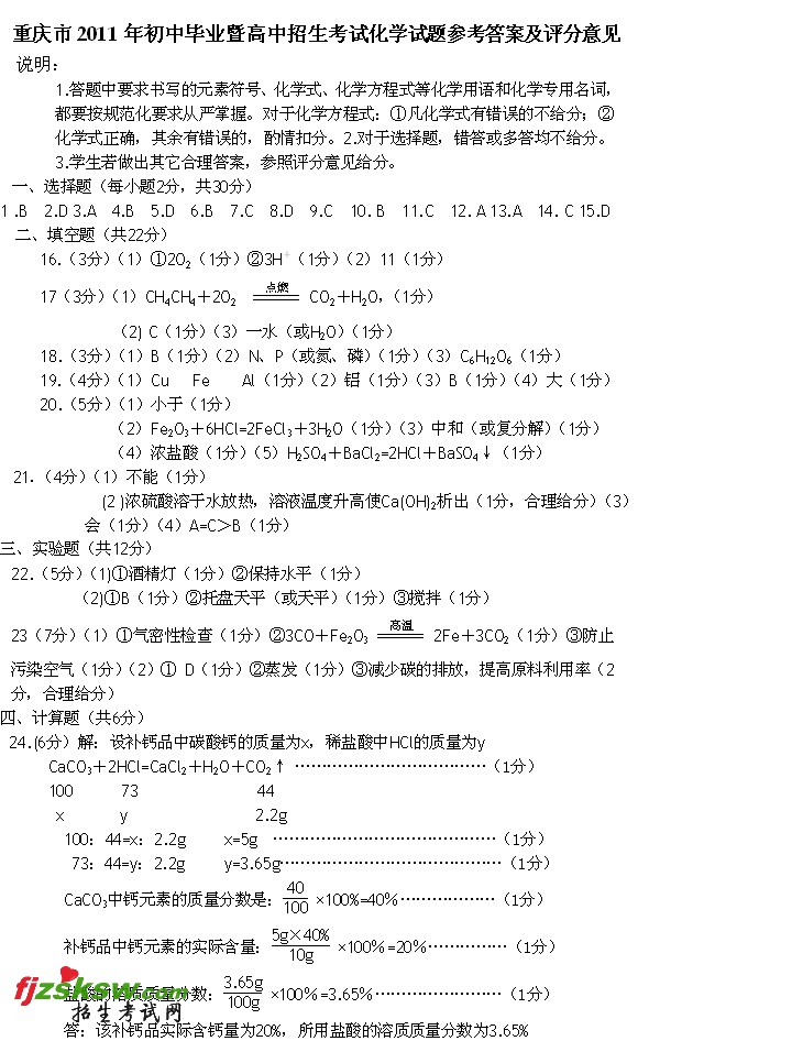 重庆2011年中考试化学试题及答案