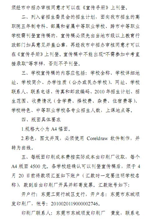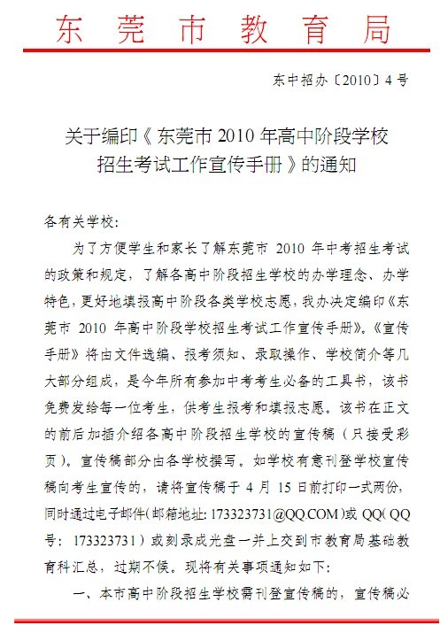 关于编印东莞市2010年高中阶段学校招生考试工作宣传手册的通知(东中招办[2010]4号)